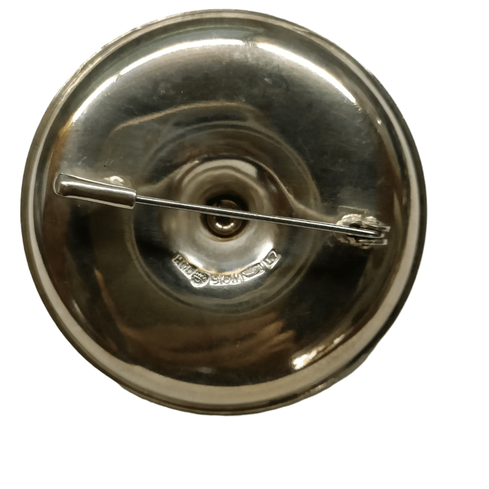 Hopeinen rintaneula, jossa ametisti kivi. Koru on valmistettu 1964.