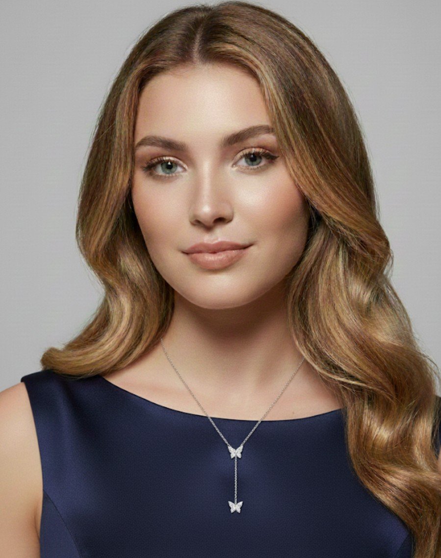 Tuo asuusi hentoa keveyttä ja luonnon kauneutta tällä elegantilla hopeisella perhoskaulakorulla, jossa kaksi siroa perhosta laskeutuvat allekkain ohuen ketjun varassa. Korun herkkä muotoilu heijastaa vapautta, keveyttä ja ajatonta naisellisuutta – täydellinen valinta niin juhlaan kuin arjen piristykseksi.