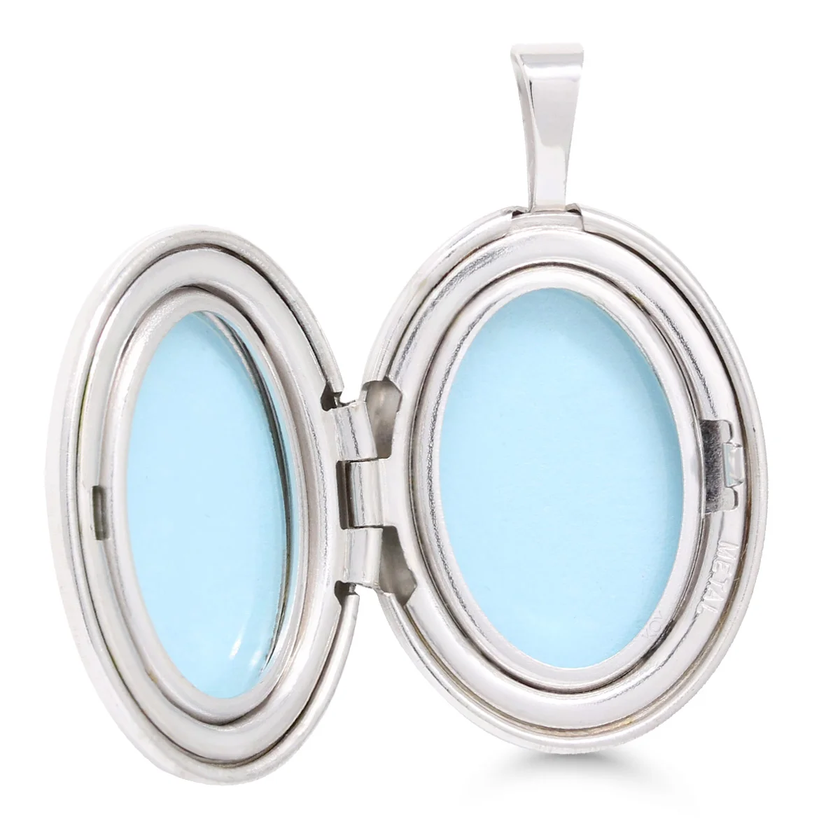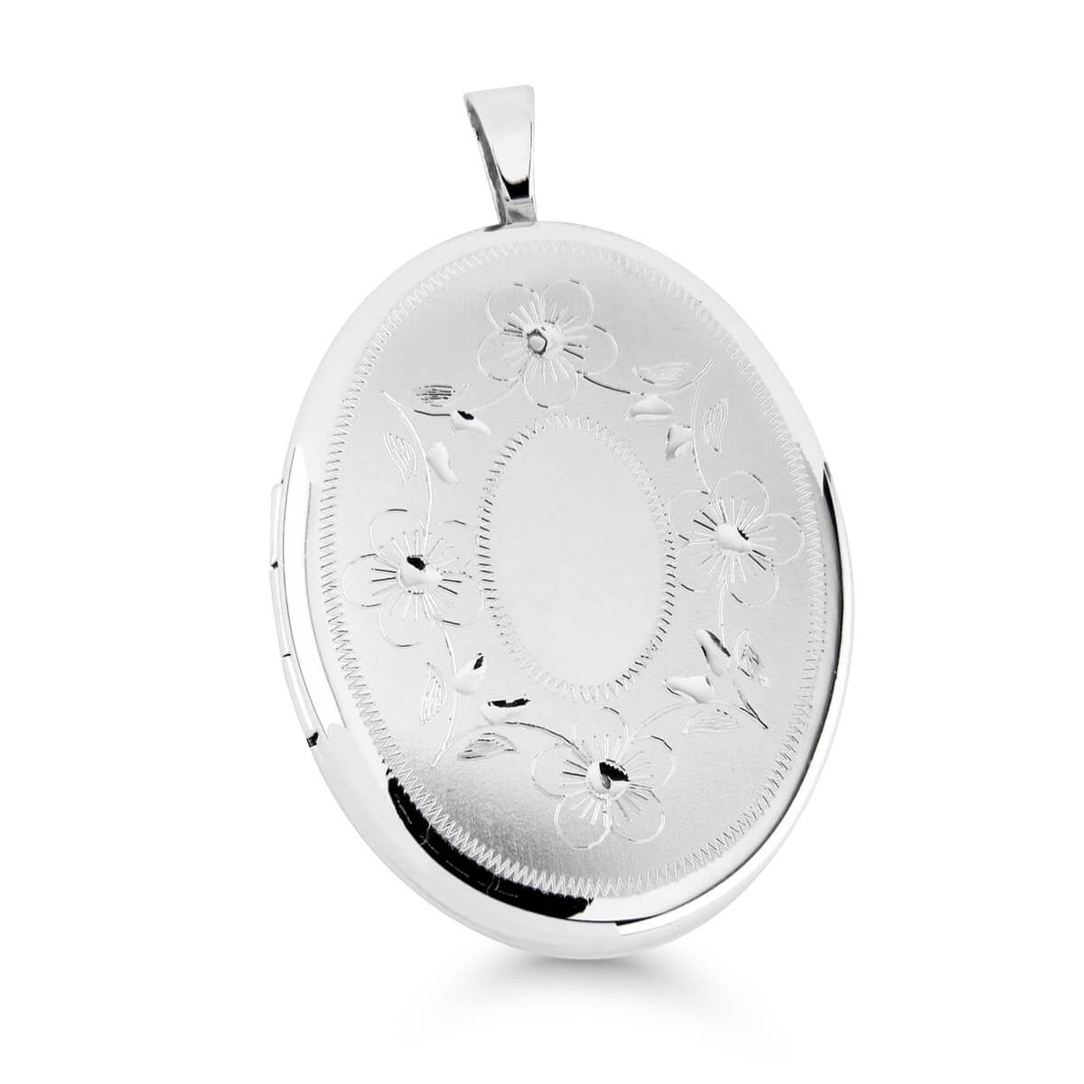 Hopeinen ovaali medaljonki – kukkakaiverruksella, tilaa kahdelle kuvalle