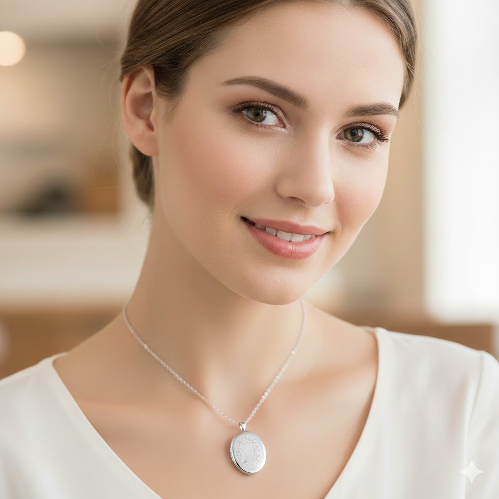 Valmistettu puhtaasta 925/1000 sterlinghopeasta ja viimeistelty rodinoinnilla, joka tuo pintaan kirkkaan kiillon ja suojaa korua tummentumilta. Medaljonki aukeaa ja sisältää paikat kahdelle pienelle valokuvalle.