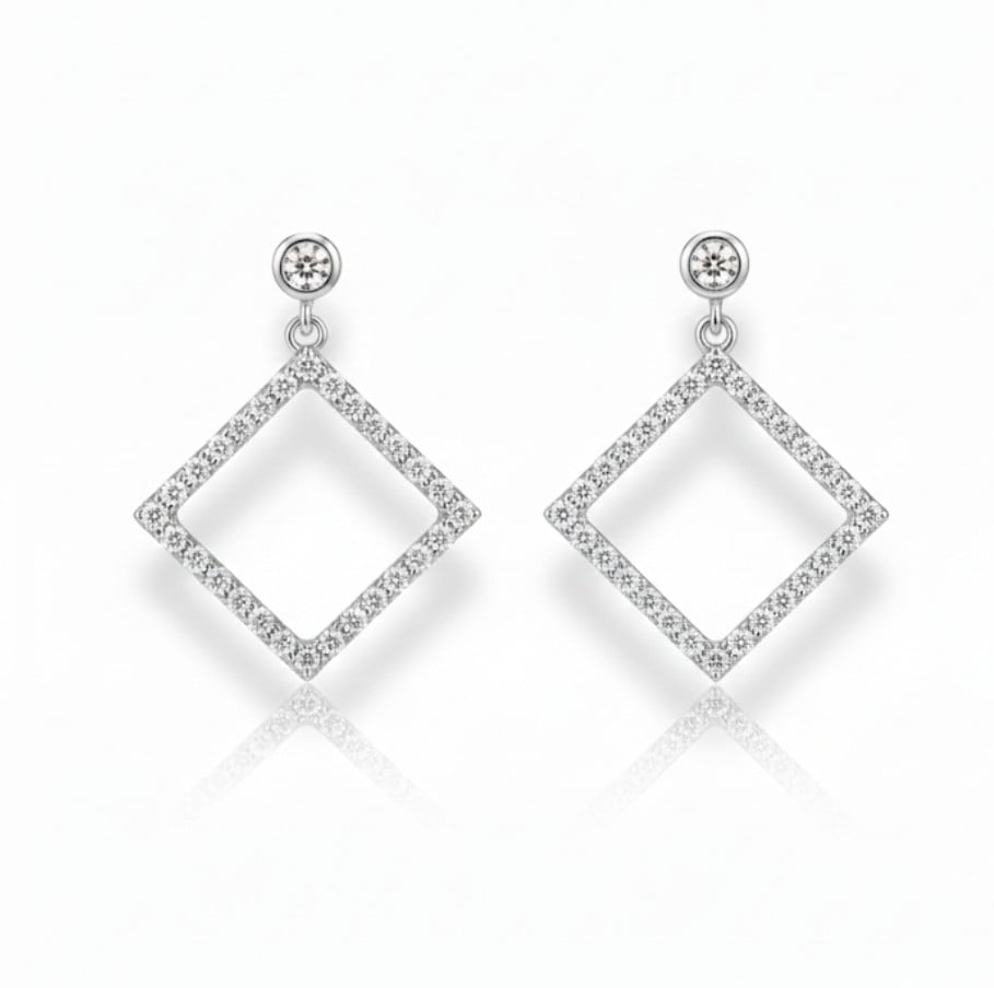 Nämä näyttävät hopeiset juhlakorvakorut hurmaavat modernilla neliönmuotoisella designillaan ja upealla säihkeellään. Avoin neliökehys on kauttaaltaan koristeltu kirkkailla zirkoniakivillä, jotka heijastavat valoa elegantisti ja tuovat korvakoruihin ylellisen ilmeen.