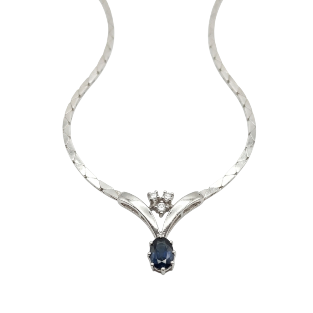 14k valkokultainen safiiri–timanttikaulakoru – vintage-harvinaisuus, sinisafiiri & 0,10 ct timantit