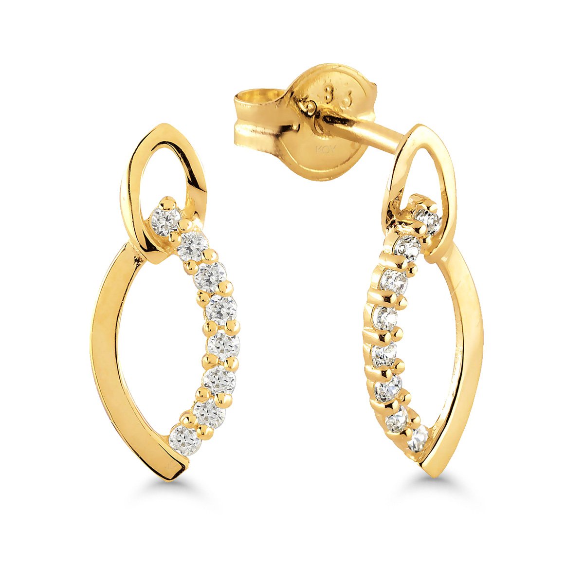 Nämä upeasti välkehtivät 585/1000 (14k) keltakultaiset korvakorut on suunniteltu korostamaan naisellista eleganssia joka tilanteessa. Korujen kevyesti kaartuva muoto yhdistettynä kirkkaasti loistaviin synteettisiin zirkoneihin luo ylellisen, mutta samalla hillityn ilmeen – täydellisen valinnan niin arjen kaunistajaksi kuin juhla-asun viimeistelijäksi.