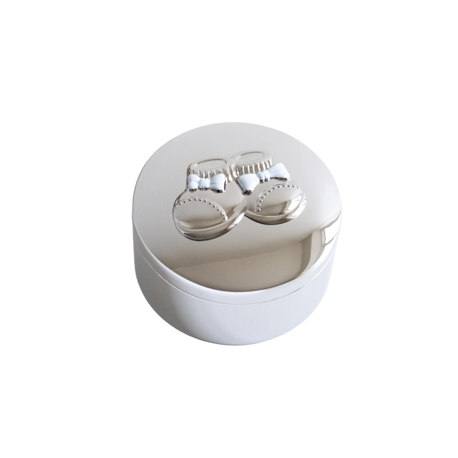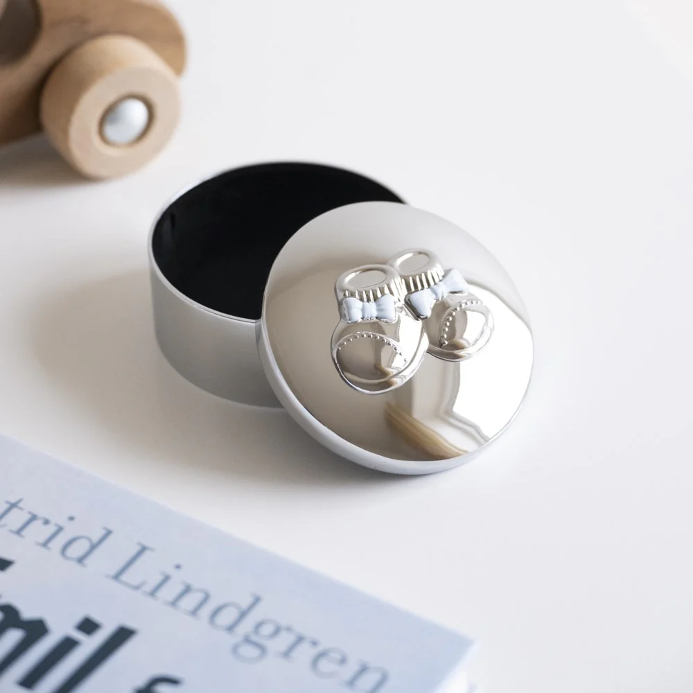 Tämä suloinen korurasia poikavauvalle hurmaa herkällä designillaan. Kannessa olevat pienet vauvan kengät ja vaaleansiniset rusetit tekevät rasiasta täydellisen lahjan kaste- tai nimiäispäivään – hetkiin, jotka ansaitsevat tulla säilytetyiksi kauniisti.