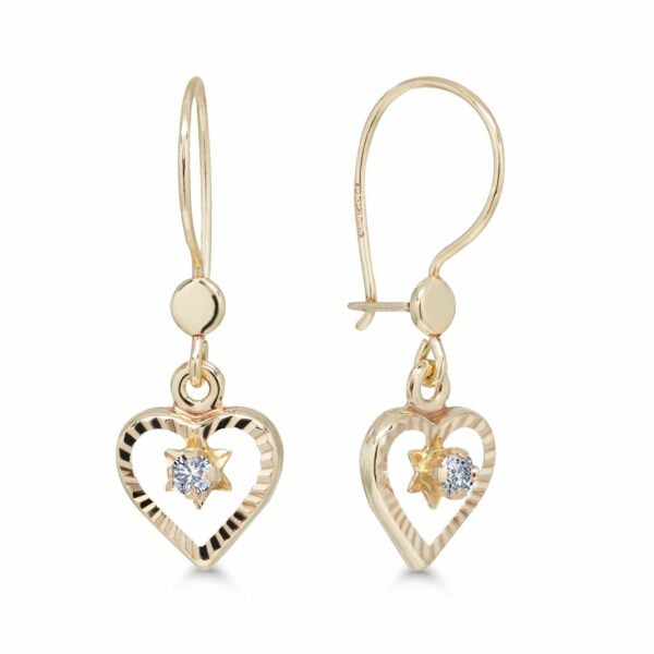 Nämä roikkuvat kultaiset sydänkorvakorut huokuvat lämpöä, romantiikkaa ja ajatonta kauneutta. Korvakorujen keskelle istutettu kirkas zirkoniakivi tuo säihkettä sydämenmuotoiseen riipukseen, ja koukkukiinnitys varustettuna kolmiolukolla takaa turvallisen ja mukavan käytön koko päivän ajan.