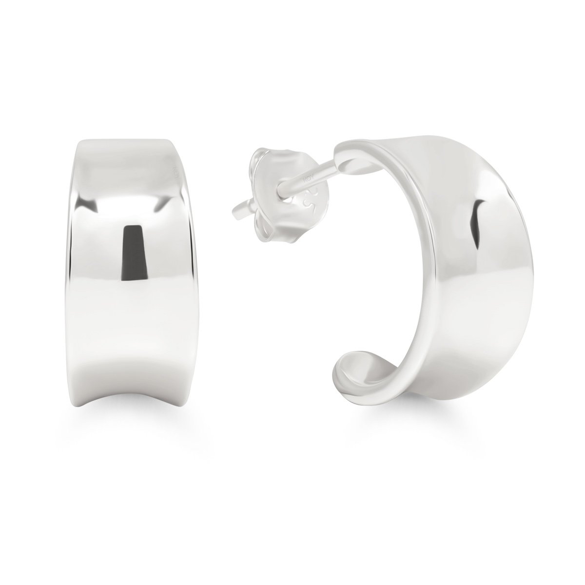 Modernit ja tyylikkäät hopearenkaat erottuvat kauniisti koveran muotoilunsa ansiosta. Leveä, 6,3 mm muotoilu ja kiiltävä rodinoitu pinta tekevät korvakoruista näyttävät, mutta kompaktin 12,8 mm ulkohalkaisijan ansiosta ne sopivat täydellisesti päivittäiseen käyttöön.
