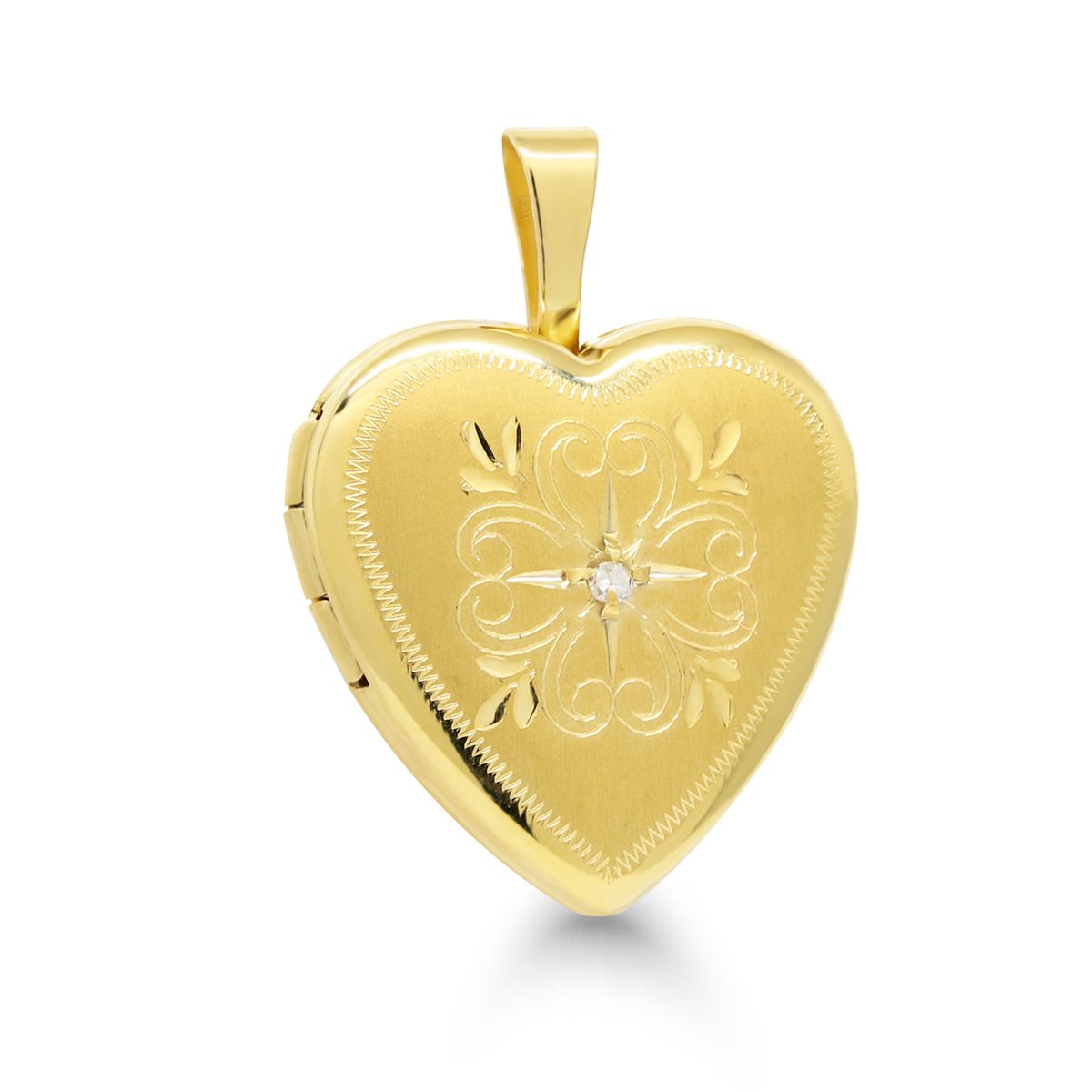Ajattoman romanttinen sydämen muotoinen kullattu hopeamedaljonki on kaunis ja henkilökohtainen koru, joka kulkee mukanasi arjen tärkeissä hetkissä. Medaljongin etupuolta koristavat hienostuneet kaiverruskuviot sekä keskelle istutettu säihkyvä aito timantti, joka tuo koruun eleganttia valon leikkiä.