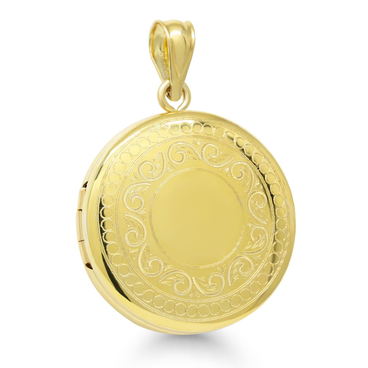 Tyylikkäästi muotoiltu ja kauniilla kaiverruksilla koristeltu kullattu pyöreä medaljonki tuo modernin säväyksen perinteiseen korumuotoon. Medaljonki on valmistettu 925 sterlinghopeasta ja päällystetty aidolla 14 karaatin kullalla, mikä antaa sille lämpimän ja arvokkaan kiillon.