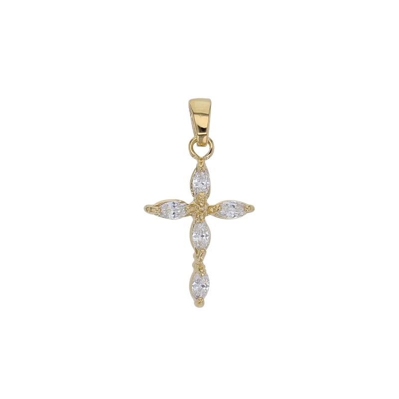Tämä kaunis kullattu ristiriipus yhdistää klassisen symboliikan ja modernin korumuotoilun keveyden. Riipus on valmistettu laadukkaasti kullatusta metallista, ja sen pintaa korostavat säihkyvät kirkkaat zirkoniat. Marquise-hiotut kivet tuovat ristille hienostuneen ja ylellisen ilmeen, joka tekee siitä erottuvan mutta edelleen ajattoman.