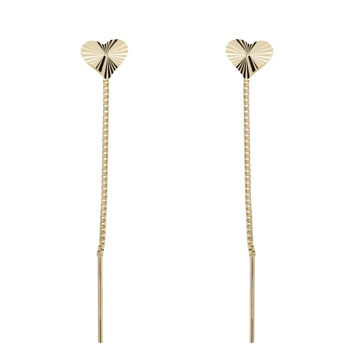 Nämä kultaiset ketjukorvakorut tuovat kantajalleen herkkää romantiikkaa ja klassista kauneutta. Korvakorujen elegantti ketju päättyy pieneen timanttileikattuun sydämeen, joka kimaltaa kauniisti valoa vasten ja antaa korulle ainutlaatuisen ilmeen. Sydänriipus on valmistettu laadukkaasta 585/1000 (14k) keltakullasta, ja sen timanttileikatut viisteet korostavat kullan kiiltävää pintaa.