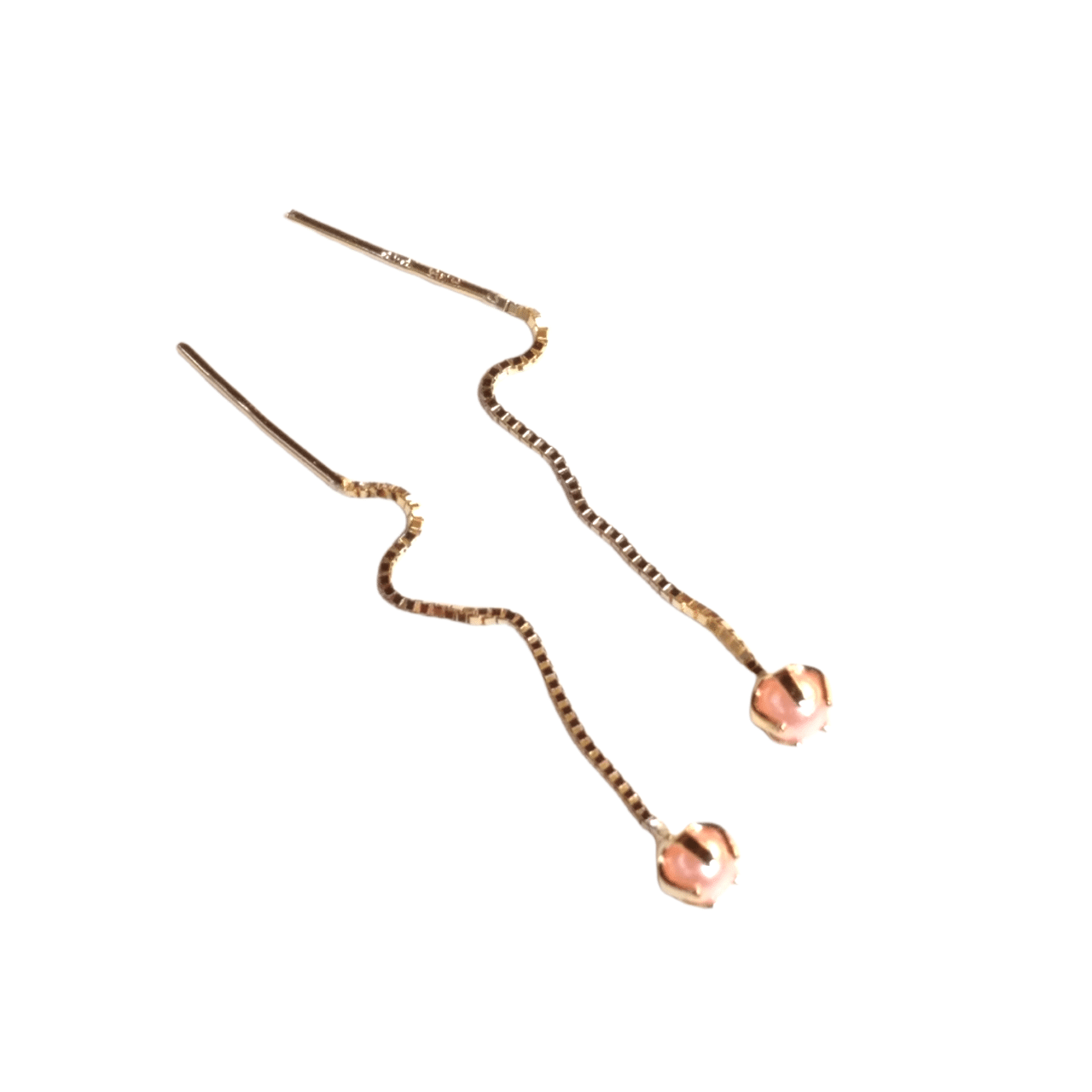 Kauniit kultaiset läpivedettävät korvakorut pienellä vaaleanpunaisella helmellä.