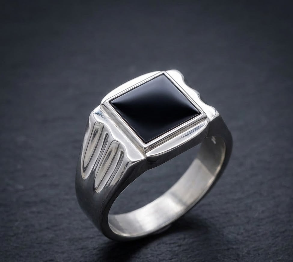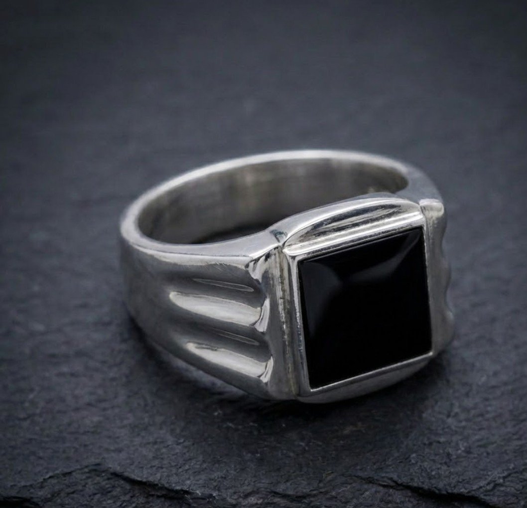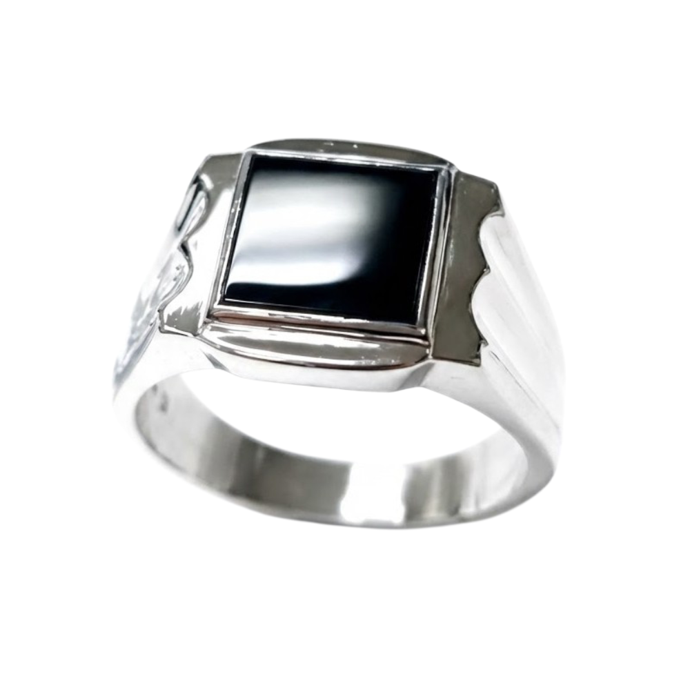 Tämä jykevä ja tyylikäs miesten kantasormus on valmistettu laadukkaasta 925 sterling-hopeasta, jossa neliönmuotoinen musta onyx-kivi. Sormuksen voimakas muotoilu ja tukeva runko tekevät siitä näyttävän valinnan jokapäiväiseen käyttöön tai juhlaan.