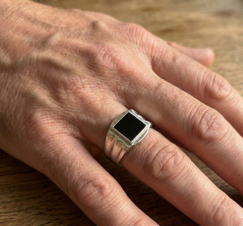Miesten hopeinen kantasormus mustalla onyx-kivellä