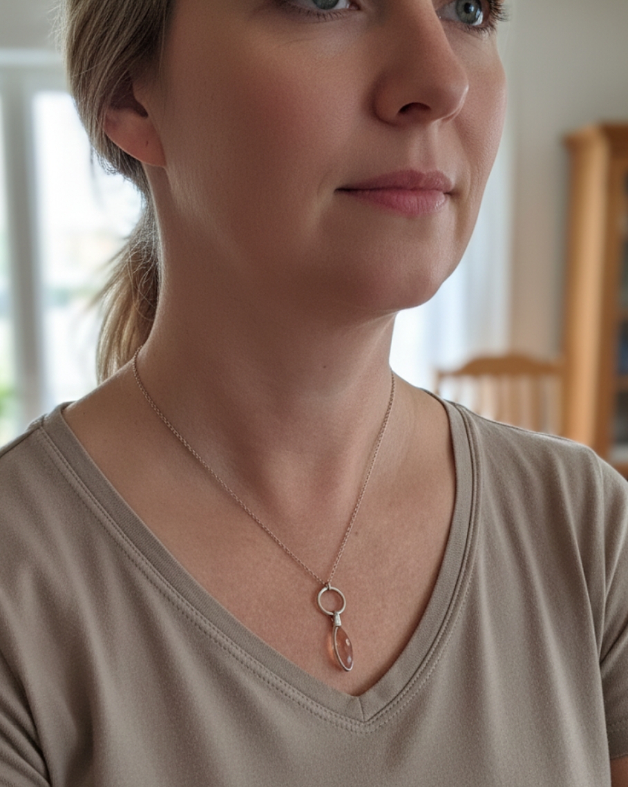 Tämä elegantti hopeinen riipus vaaleanpunaisella hiotulla kristallilla on herkkä ja ajaton koru, joka tuo kauniin säväyksen niin arkeen kuin juhlaan. Pitkulainen, kevyesti muotoiltu kristalli heijastaa valoa hienostuneesti ja luo koruun ilmavan, naisellisen ilmeen.