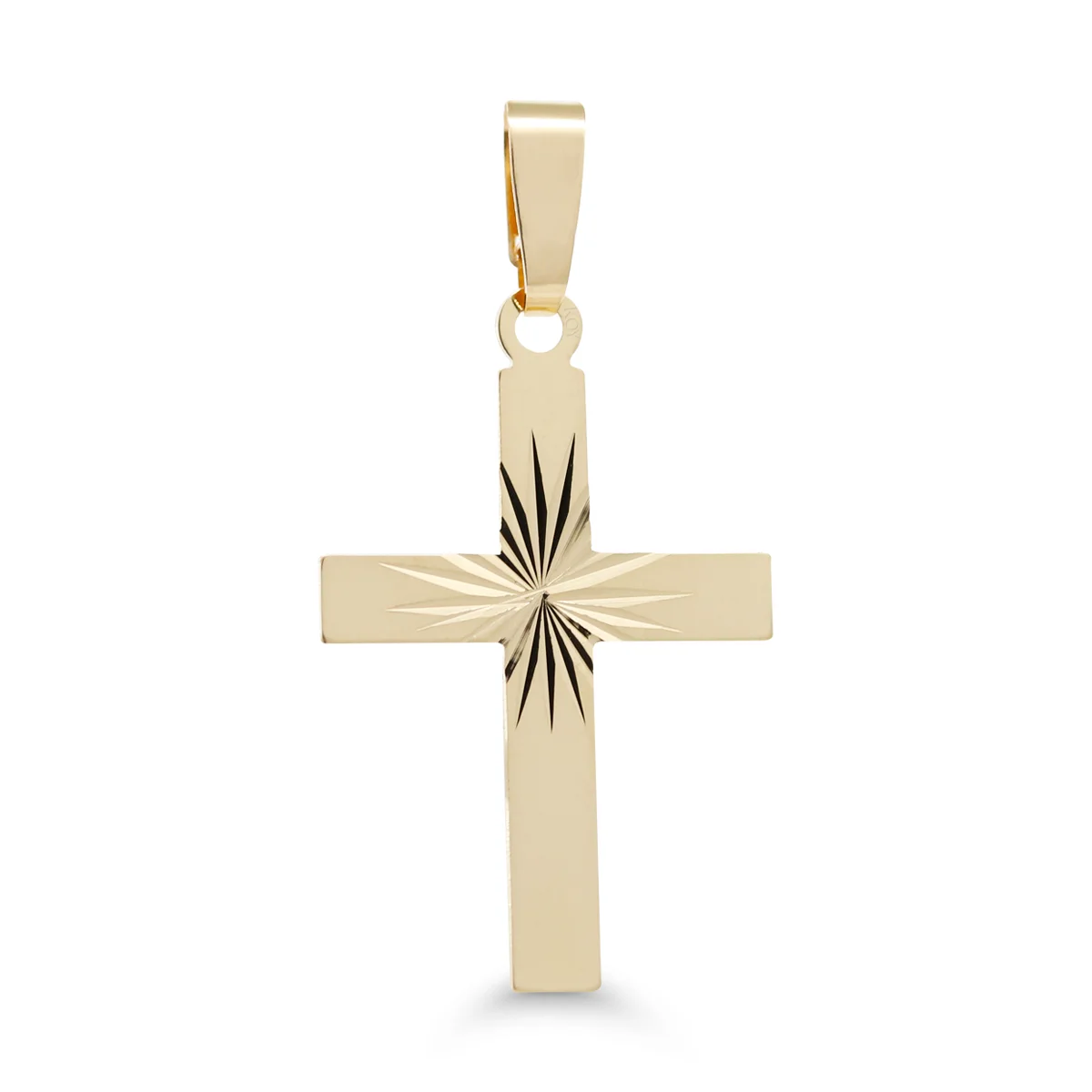 Tämä 14 karaatin keltakultainen ristiriipus on klassinen valinta. Etupuolen timanttileikattu kuviointi heijastaa valoa kauniisti, tuoden koruun hienostunutta säihkettä. Ristissä on kaunis mattapinta ja se on erittäin litteä ja ohut.