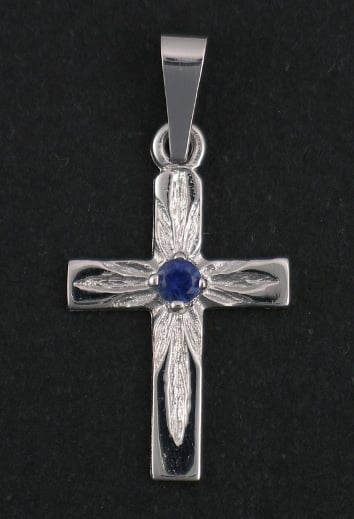 Kaunis valkokultainen ristiriipus aidolla sinisellä safiirikivellä.
