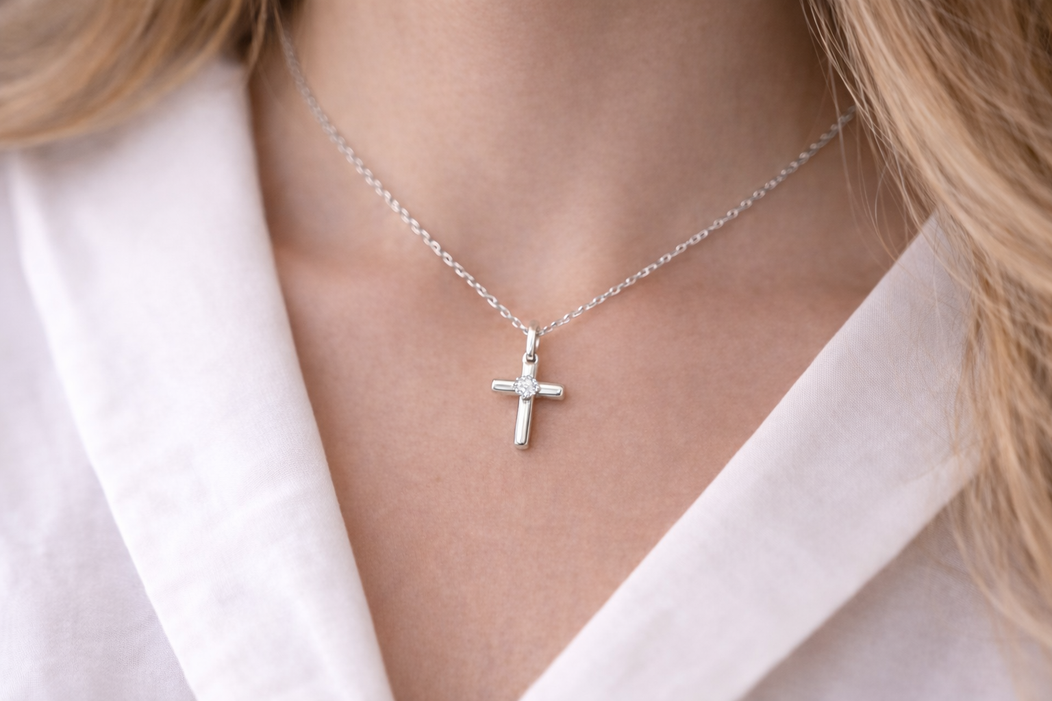 Herkästi säihkyvä valkokultainen ristiriipus zirkoniakivellä – 14K kulta