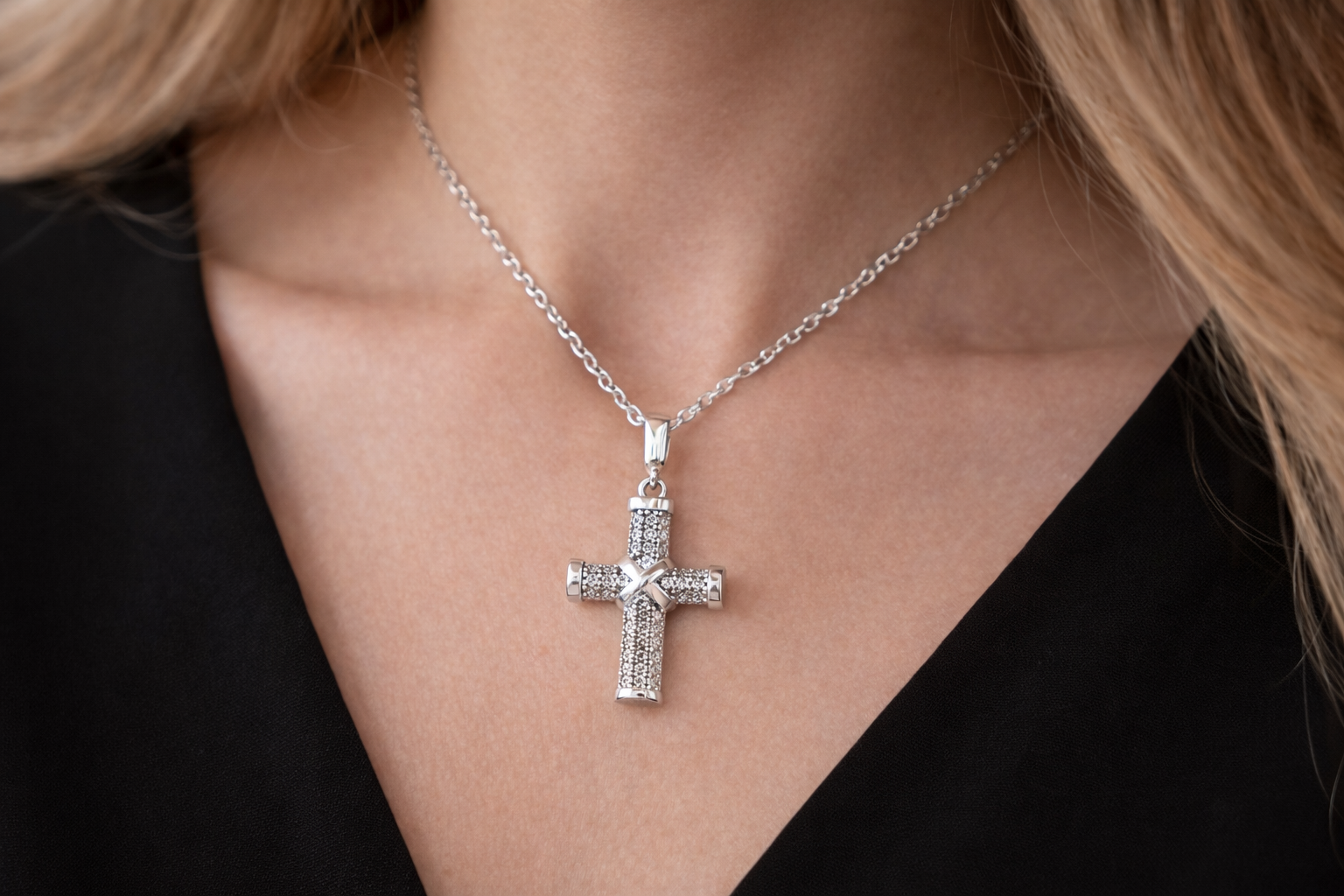 Näyttävä hopeinen ristiriipus cubic zirkoniakivillä ja ketjulla – 45 cm