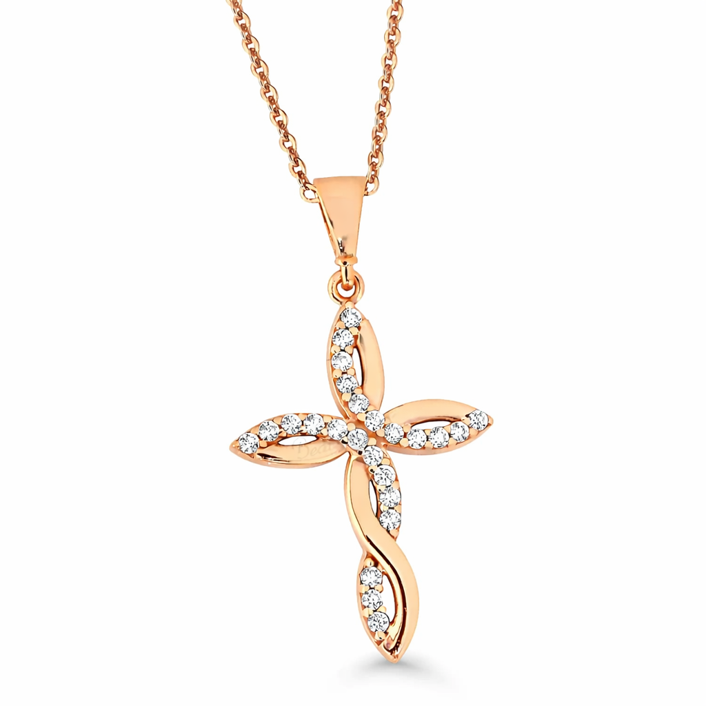 Tämä elegantti risti-kaulakoru erottuu joukosta kaarevalla, lehtimäisellä muotoilullaan, joka tuo koruun hienostuneen ja ajattoman ilmeen. Risti on valmistettu 925 sterlinghopeasta ja viimeistelty ruusukultauksella, joka antaa kauniin pinnan ja suojaa tummumista vastaan. Ristin pintaa koristavat säihkyvät synteettiset zirkonit, jotka heijastavat valoa näyttävästi.