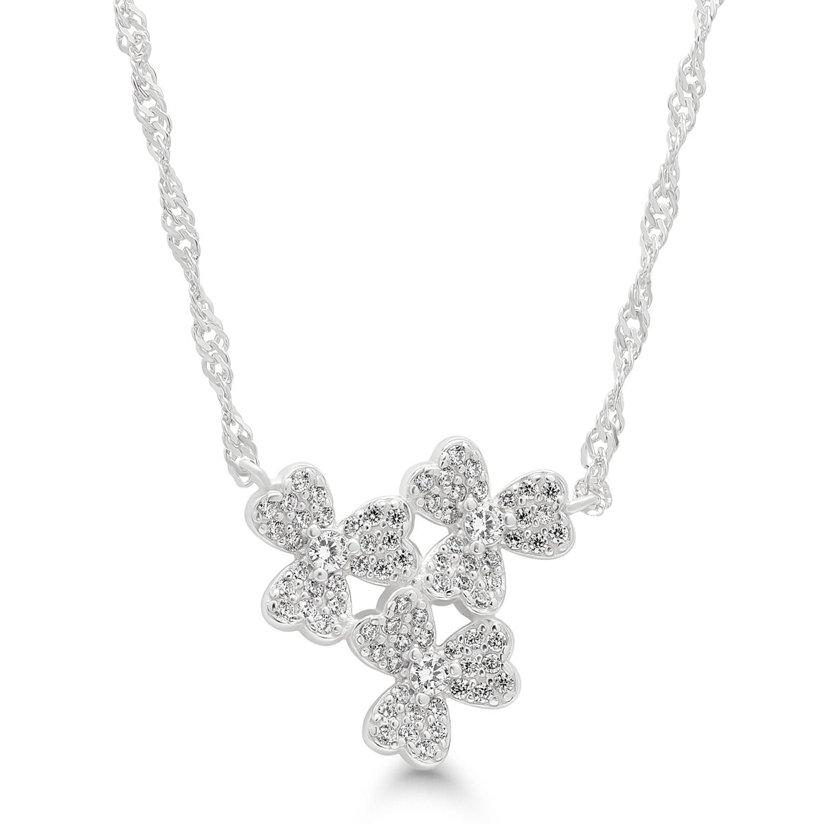 Tuo asuusi ripaus onnea ja ajatonta eleganssia tällä kauniilla rodinoidulla 925-hopeisella kaulakorulla, jossa loistaa kolmen apilan upea koruosio. Jokainen apilanlehti on koristeltu säihkyvillä synteettisillä zirkoneilla, jotka tuovat koruun hienostunutta kimallusta sekä kevyen ylellistä ilmettä.