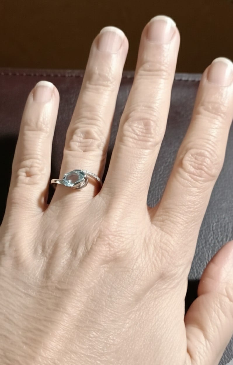 Tämä elegantti valkokultainen topaasikorusormus hurmaa upealla vaaleansinisellä hohteellaan ja naisellisella muotoilullaan. Sormuksen keskellä loistaa kauniin vaaleansininen topaasi, jonka koko on näyttävä 8 × 6 mm. Soikean topaasin sävy heijastaa valoa rauhallisesti ja säihkyvästi, tuoden sormukseen raikkautta ja arvokasta väriä.