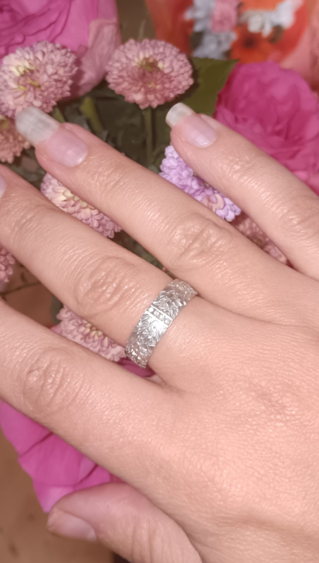 Valmistettu laadukkaasta 925 sterlinghopeasta, sormus on 6 mm leveä ja 1,8 mm korkea – tukeva mutta miellyttävä käyttää päivittäin. Pyöristetty sisäpinta lisää käyttömukavuutta, ja ajaton muotoilu yhdistettynä rosoiseen pintaan tekee tästä sormuksesta persoonallisen symbolin tärkeälle lupaukselle.