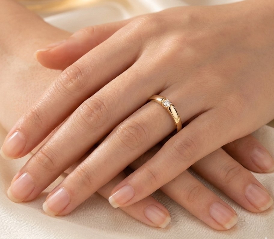 Sormus on valmistettu 14 karaatin kullasta, ja sen selkeä, perinteinen muotoilu tekee siitä erinomaisen valinnan niin vihkisormukseksi kuin kivelliseksi kihlasormukseksi. Yksikivinen timantti antaa sormukselle klassisen ilmeen, joka sopii monenlaiseen tyyliin ja on helppo yhdistää muiden korujen kanssa.