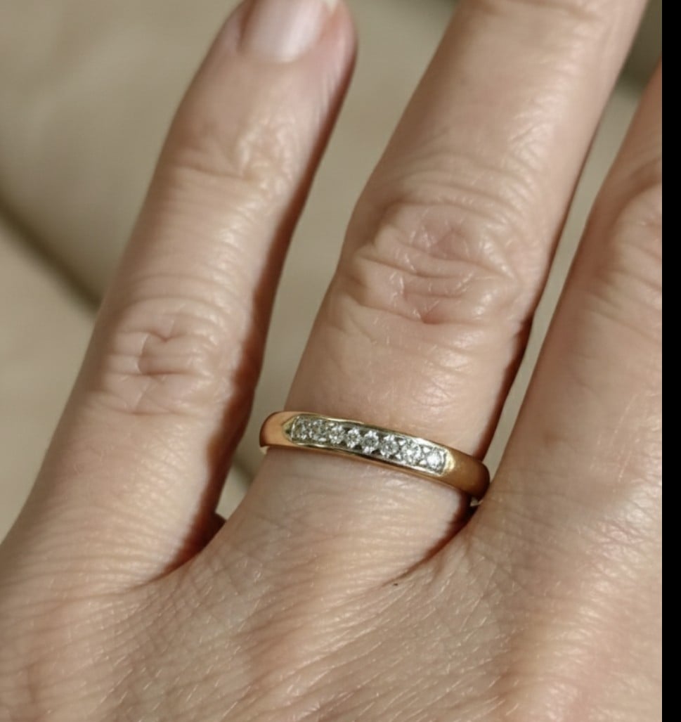 Sormukseen on istutettu yhdeksän W/Si-laatuista 0,005 ct timanttia – yhteensä 0,045 ct. Pienet timantit luovat hillityn kimmellyksen, joka tekee sormuksesta täydellisen sekä arkeen että juhlaan.