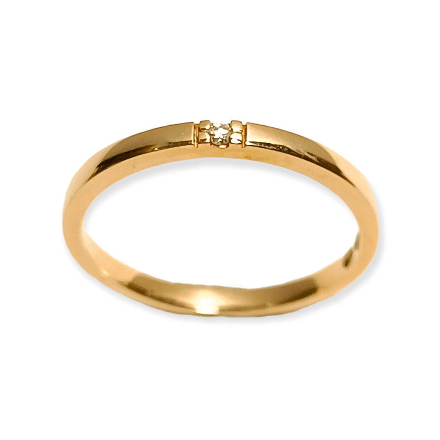 Sormuksen keskelle on istutettu 0,015 ct SI/W -luokan briljanttihiontainen timantti, joka antaa sormukselle hienostuneen, mutta hillityn säihkeen.