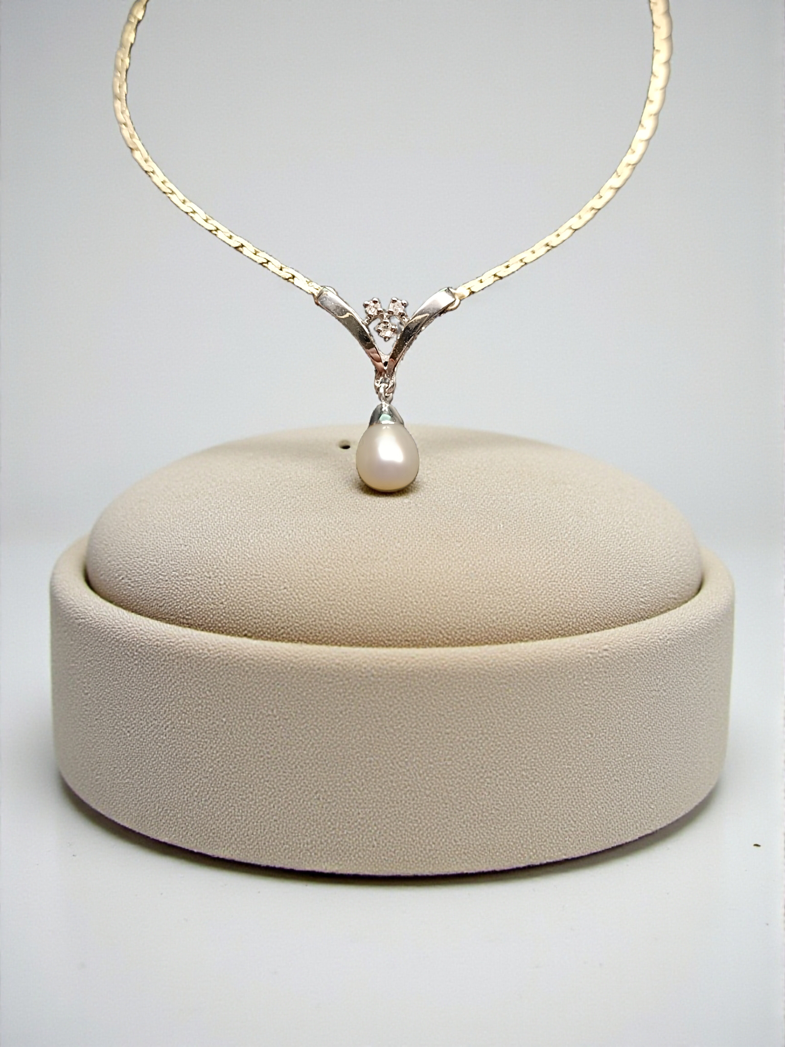 Kaulakorun runko on valmistettu yhdistelmästä 14 karaatin keltakultaa ja valkokultaa, joiden kontrasti korostaa korun hienostuneita linjoja. Keskiosaa koristaa meriveden viljelty pisaranmuotoinen helmi, kooltaan noin 7 mm, jonka pehmeä hohde viimeistelee kokonaisuuden hurmaavalla tavalla.